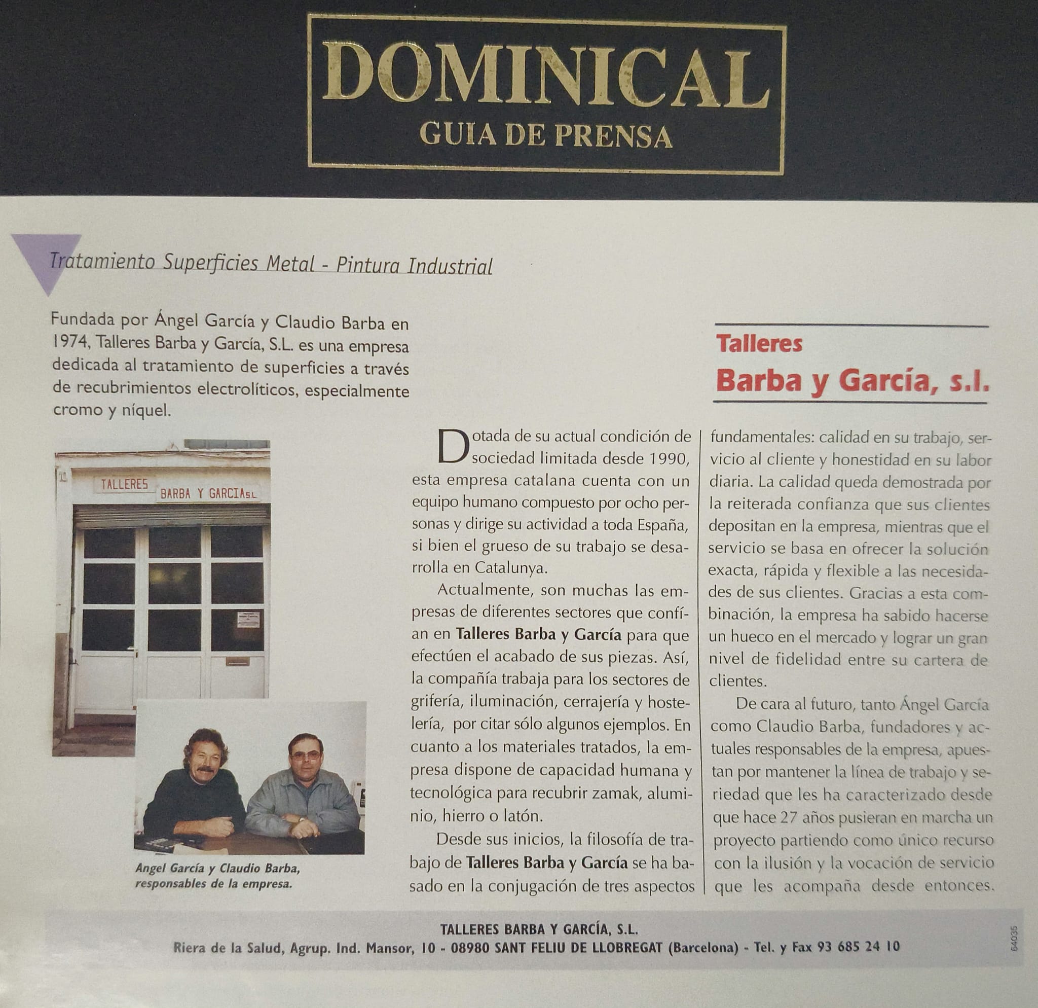 Fundada en 1974 y gestionada por Ángel García y Claudio Barba, Talleres Barba y García S.L es una empresa familiar. Tiene la capacidad, experiencia y calidad para resolver los problemas de producción más complejos de nuestros clientes.