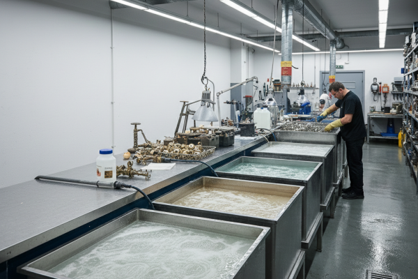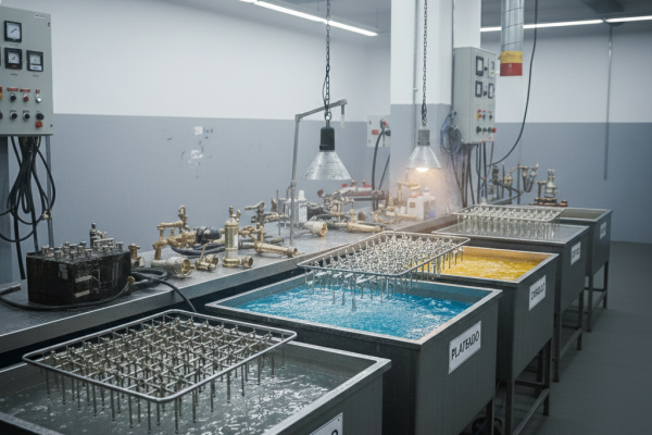 Limpieza Mecánica y Pulido: Se eliminan óxidos, corrosión y arañazos. Es crucial que la superficie base esté pulida con el brillo deseado, ya que el baño metálico (especialmente el oro y la plata) replicará cualquier imperfección.